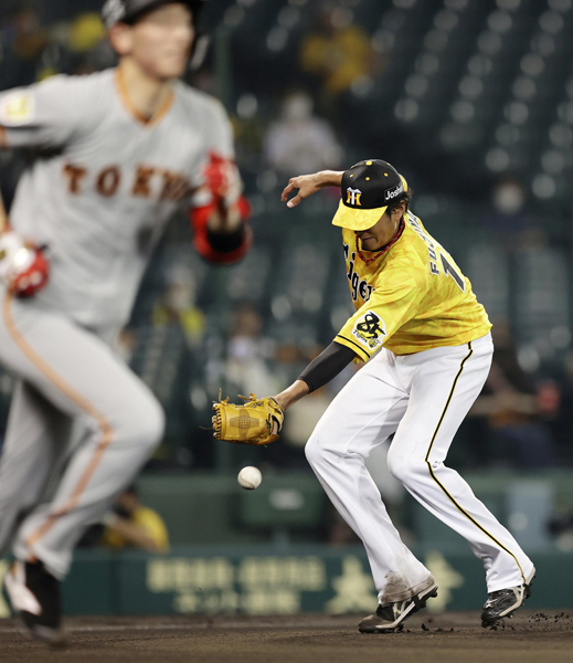 六回に戸郷(左)の投ゴロを取り損ねた藤浪(C)共同通信社