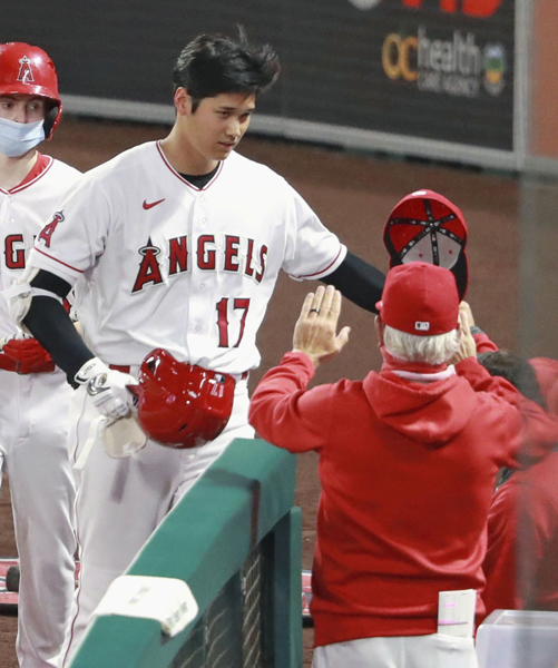7月30日(日本時間)のマリナーズ戦で今季初本塁打となる逆転3ランを放ってマドン監督(右)に迎えられる大谷(C)共同通信社