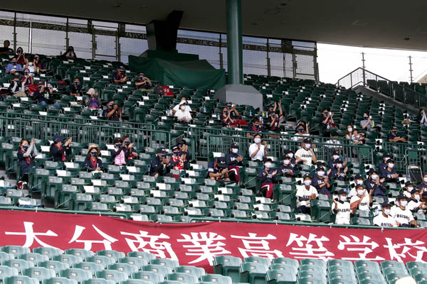 銀傘の下で観戦する大分商の部員と保護者(C)日刊ゲンダイ