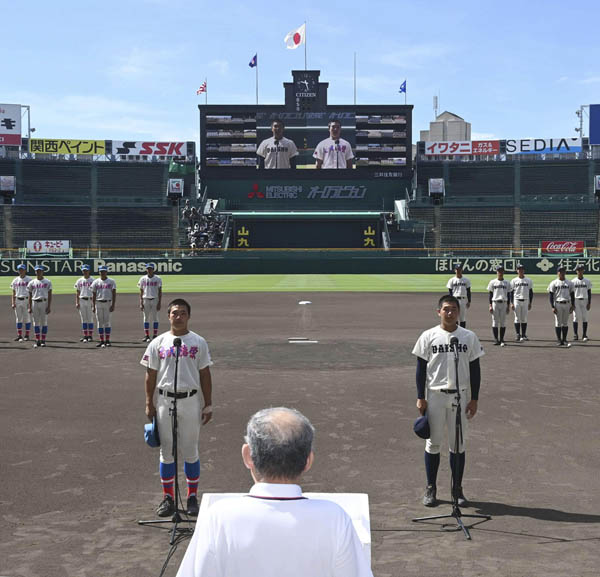 2020年甲子園高校野球交流試合の開会式で選手宣誓する大分商の川瀬堅斗主将(右)と花咲徳栄の井上朋也主将(代表撮影)