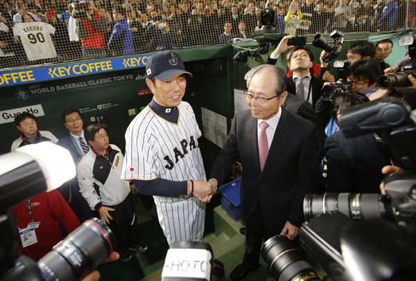 日本代表監督当時の小久保、初代WBC監督の王貞治氏と(C)日刊ゲンダイ