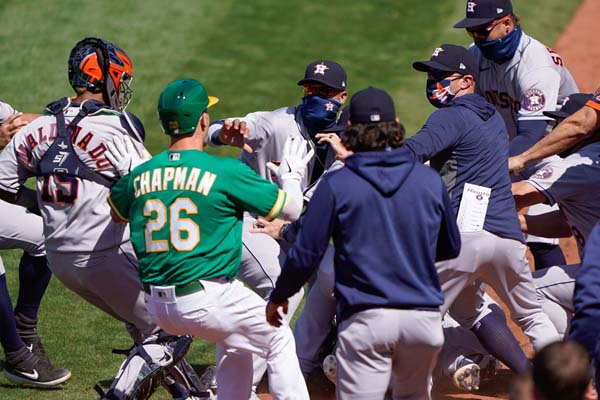 死球を巡ってアスレチックスとアストロズが大立ち回り(C)ロイター/USA TODAY Sports
