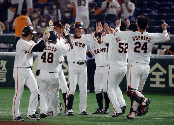 九回に代打でサヨナラ打を放ち、ナインの祝福を受ける16年目の亀井(央)も中大OB(C)日刊ゲンダイ