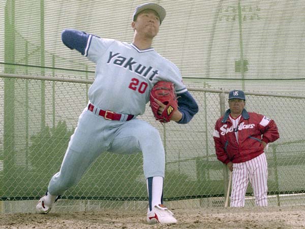 ヤクルト入団1年目に新人王を獲得した伊藤智仁(後方は野村克也監督=当時)/(C)共同通信社