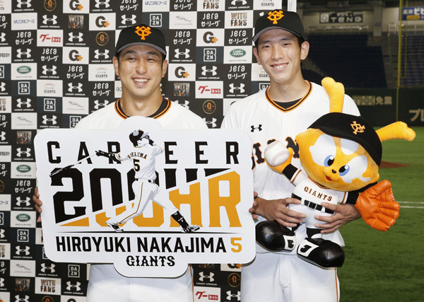 中島(左)とお立ち台に立つ戸郷(C)共同通信社