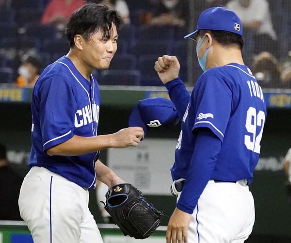 球団14年ぶりの3試合連続完投勝利の大野雄(左)/(C)共同通信社
