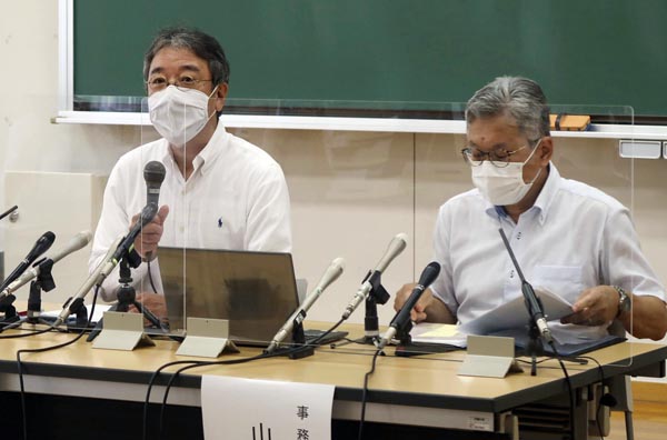 天理大ラグビー部で53人感染、記者会見する天理大の岡田龍樹副学長(左)ら(C)共同通信社