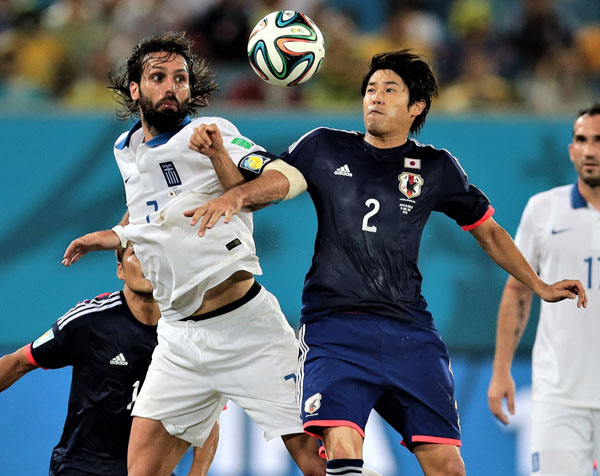 2014年ブラジルW杯・ギリシャ戦で競り合う内田(C)Norio ROKUKAWA/office La Strada