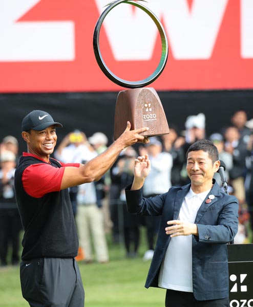 2019年のZOZO選手権はウッズが優勝(右は前澤友作大会名誉会長)/(C)日刊ゲンダイ