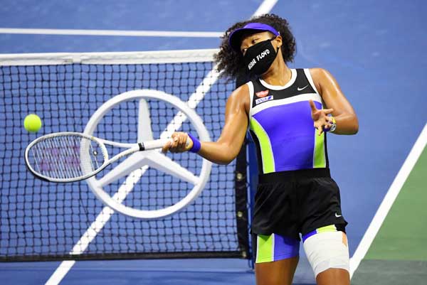 被害者の名前が書かれたマスクをつけてコートに立つ大坂なおみ(C)ロイター/USA TODAY Sports
