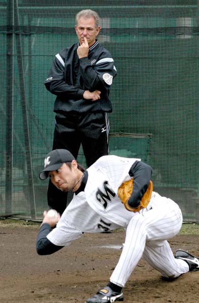 投球練習を見守るバレンタイン監督(C)日刊ゲンダイ