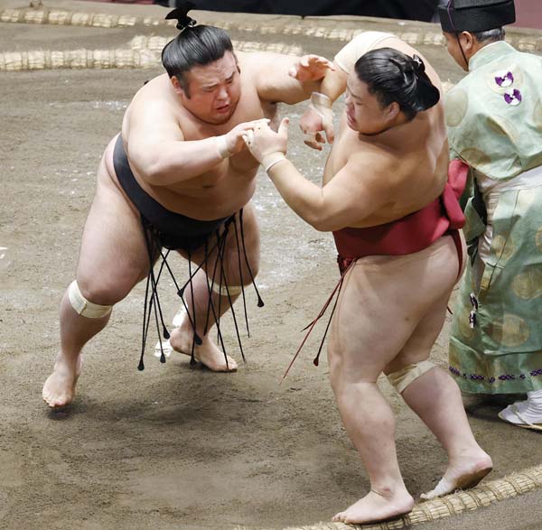 10日目、押し出しで大栄翔を下す貴景勝(左)/(C)共同通信社
