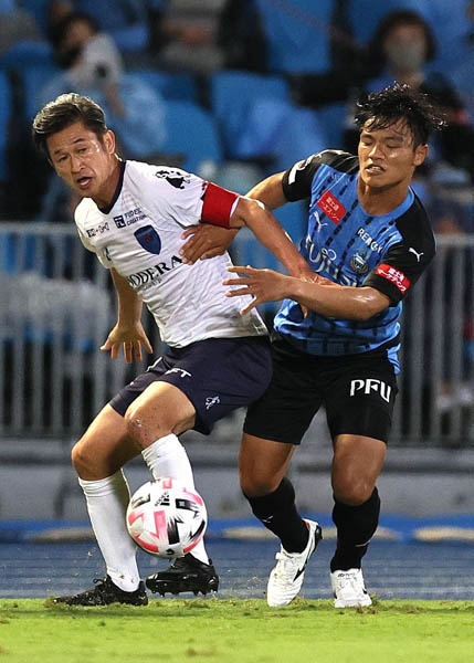 川崎戦でボールをキープするカズ(C)Norio ROKUKAWA/office La Strada