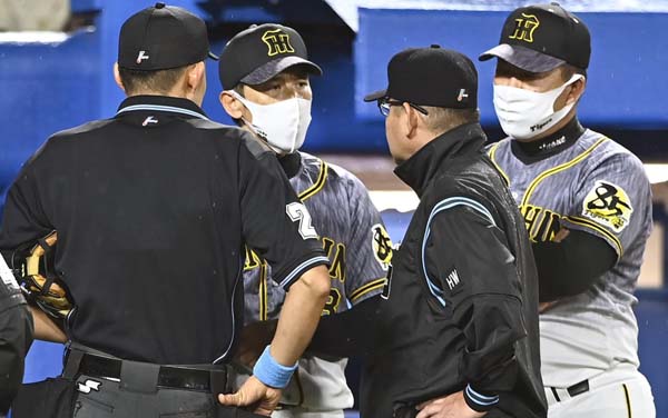 悪いことはしてないとはいえ…(審判団と激しく言い合う矢野監督=右から3人目)/(C)共同通信社