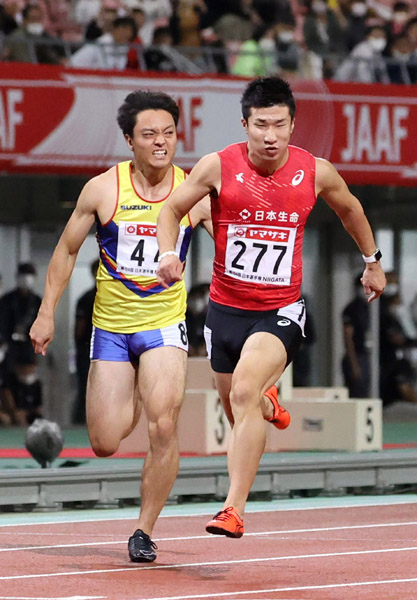 男子100メートルで6年ぶり2度目の優勝を決めた桐生(右)/(C)日刊ゲンダイ