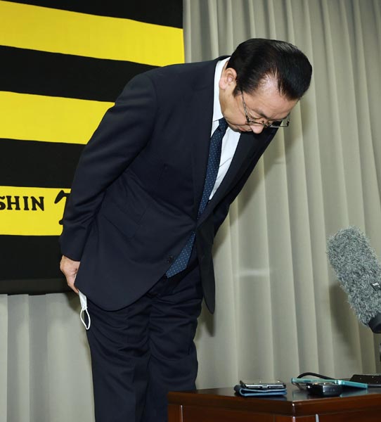 記者会見で頭を下げる揚塩球団社長(代表撮影)