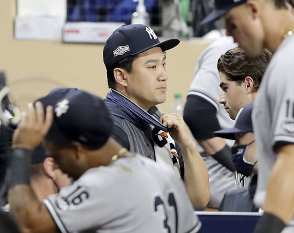 地区シリーズ敗退の戦犯とも(八回にレイズに勝ち越され、ベンチでぼうぜんとするヤンキース・田中)/(C)共同通信社