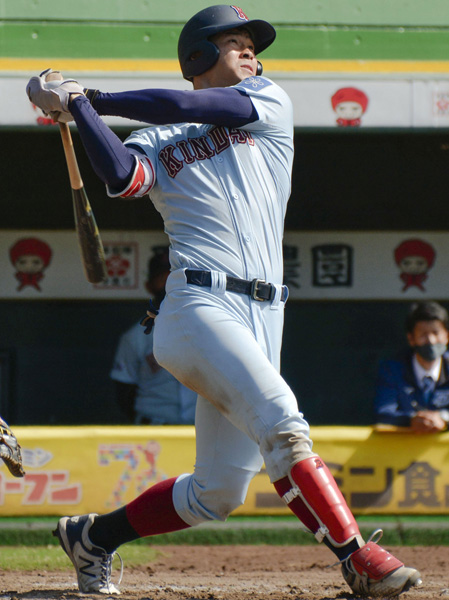 関西学生野球リーグの通算本塁打記録に並ぶ通算13本目の右越え2ランを放つ(C)共同通信社