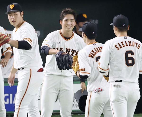 先発した高橋(中央)が424日ぶりの白星を挙げ、巨人のマジックは「9」に(C)共同通信社