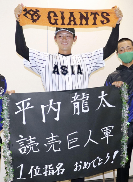 巨人から1位指名を受け、喜ぶ亜大の平内龍太投手(C)共同通信社