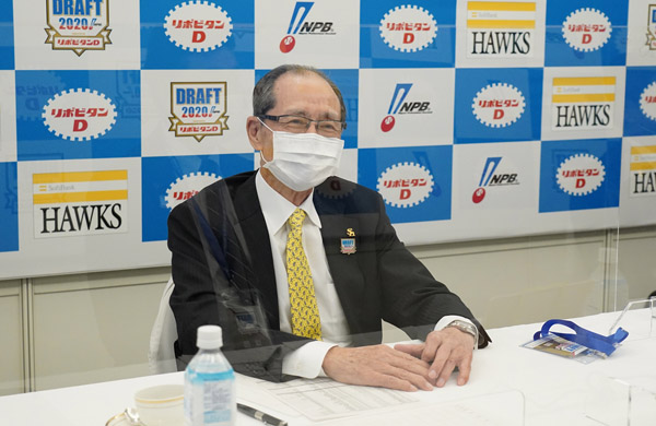 王会長もマスク越しにニッコリ(C)NPB/BBM2020