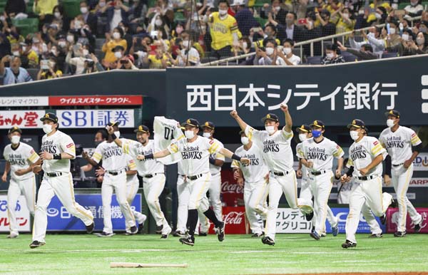 3年ぶりのパ・リーグ優勝を決め、ベンチを飛び出すソフトバンクナイン(C)共同通信社