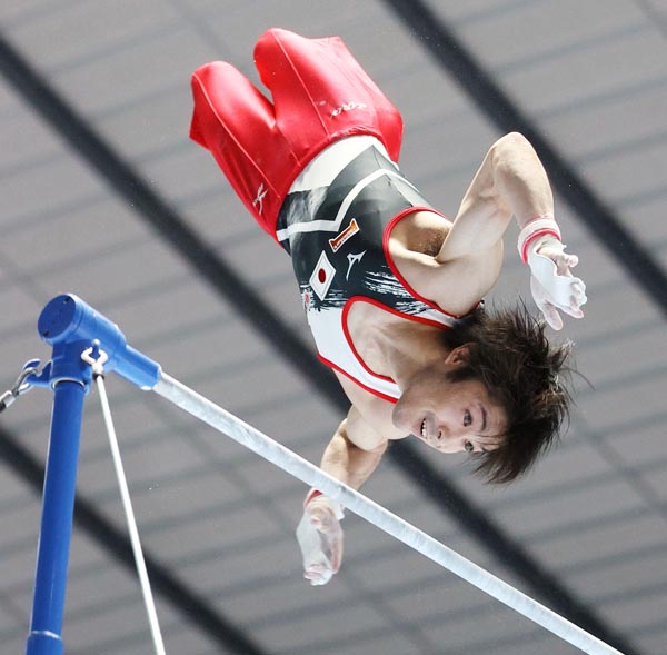 8日、体操の国際大会の鉄棒の演技でH難度の離れ技「ブレトシュナイダー」を決める内村航平(代表撮影)