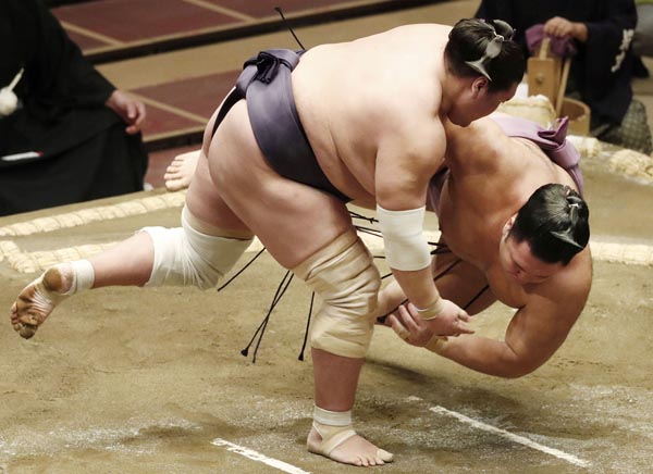 照ノ富士(左)、朝乃山に豪快な上手投げ(C)共同通信社