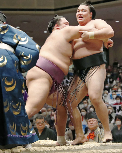 朝乃山(左)は初日の霧馬山戦で右肩を痛めたという(C)共同通信社