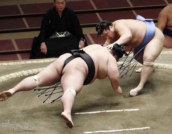 貴景勝、はたき込みにバッタリ(C)共同通信社