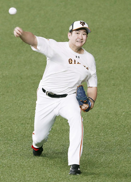日本シリーズ前日に調整する菅野(C)共同通信社