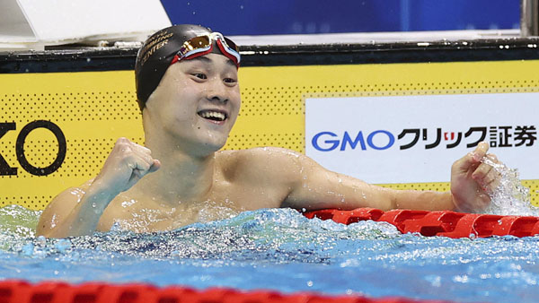 男子100メートル平泳ぎを59秒59で制し、喜ぶ佐藤翔馬(C)共同通信社