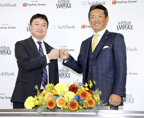 就任会見でソフトバンクの三笠GMとポーズをとる小久保裕紀ヘッドコーチ(右)/(C)共同通信社