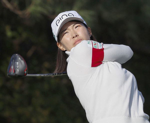 第3ラウンド、13番でティーショットを放つ渋野。通算4アンダーで単独首位(C)共同通信社