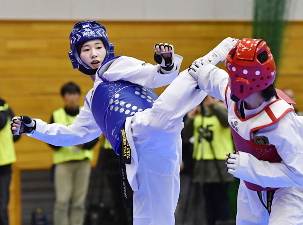 テコンドー五輪最終選考会 女子49キロ級決勝、村上智奈(右)を破り、東京五輪日本代表を手にした山田(C)共同通信社