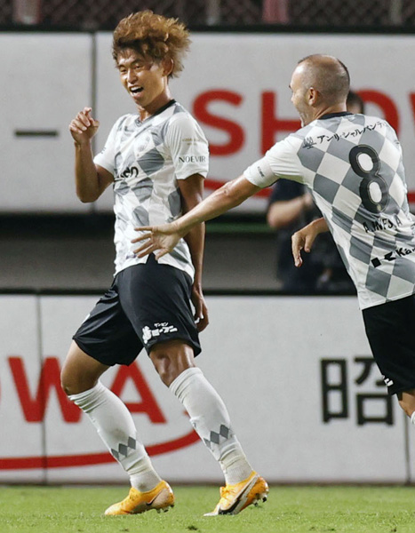 ゴールを決めてイニエスタに祝福される郷家(C)共同通信社