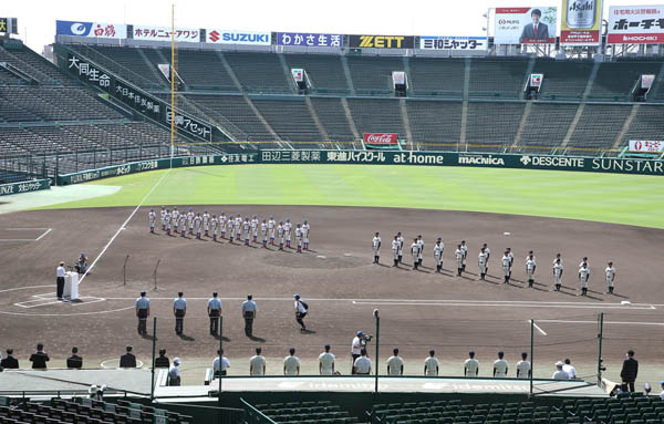 「甲子園」は高校野球部員の夢(コロナで第一試合の大分商と花咲徳栄が参加し、無観客の中で行われた開会式)/(C)日刊ゲンダイ