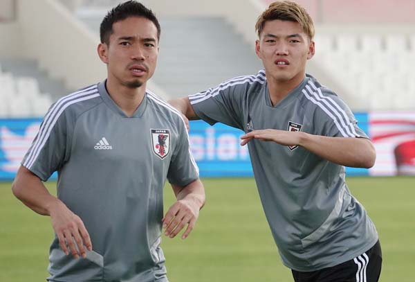 代表練習中の長友(左)と堂安(C)Norio ROKUKAWA/Office La Strada