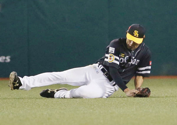 2016年には守備時に右手薬指を骨折した柳田(C)共同通信社