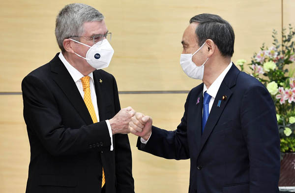 菅首相(右)はIOCのバッハ会長とグータッチしていたが、「デッドライン」はすぐそこ…(C)共同通信社