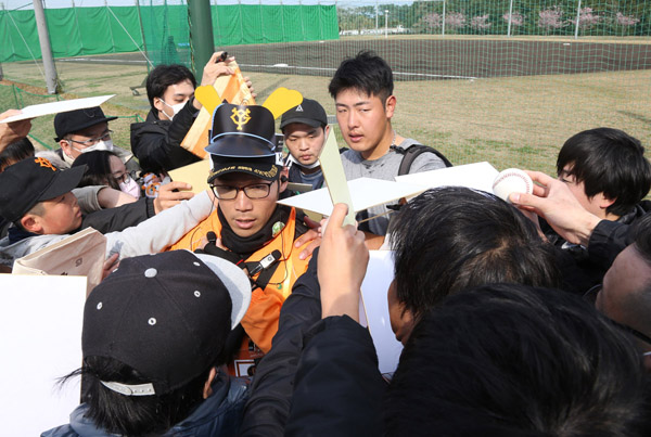 昨2020年までこんな光景は当たり前だったが…(ファンからサインを求められる巨人岡本)/(C)日刊ゲンダイ