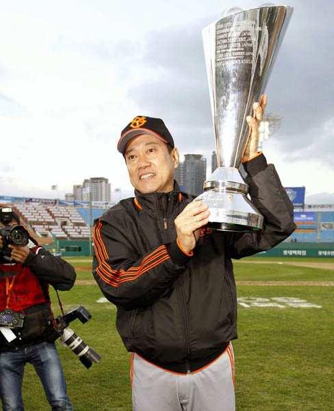 アジアシリーズを制し、優勝トロフィーを掲げる原監督(C)共同通信社