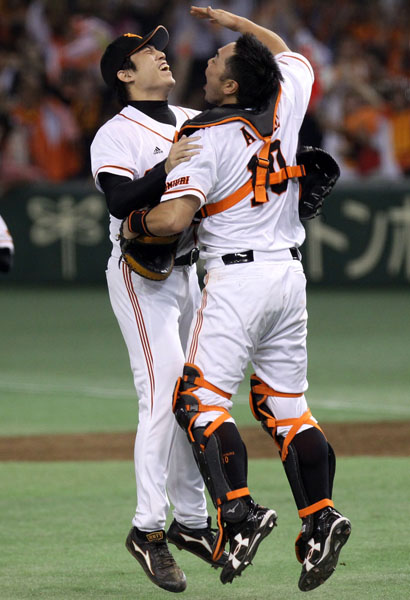 日本シリーズ進出を決めて喜ぶ西村(左)と阿部(2012年CS第6戦)/(C)日刊ゲンダイ