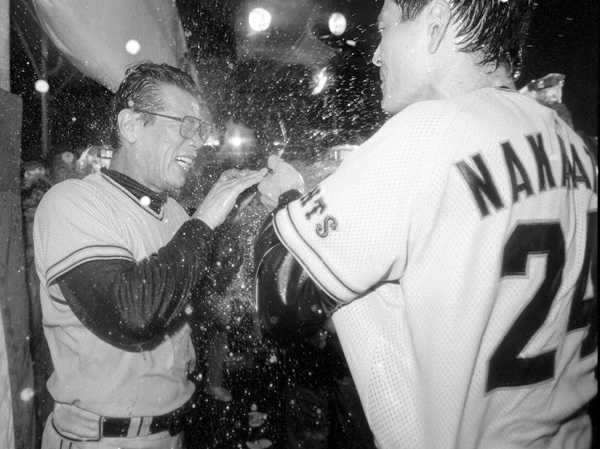 1989年のリーグ優勝時、選手にビールをかけられる藤田監督(左)/(C)共同通信社