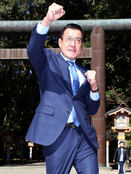 宮崎神宮の鳥居の前でガッツポーズをする原監督(C)日刊ゲンダイ