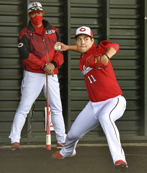 佐々岡監督(左)に見守られ2時間ぶっ通しの投げ込みの九里(C)共同通信社