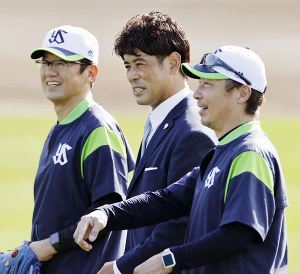 一堂に会した黄金時代メンバー(左から古田氏、稲葉氏、高津監督)/(C)共同通信社