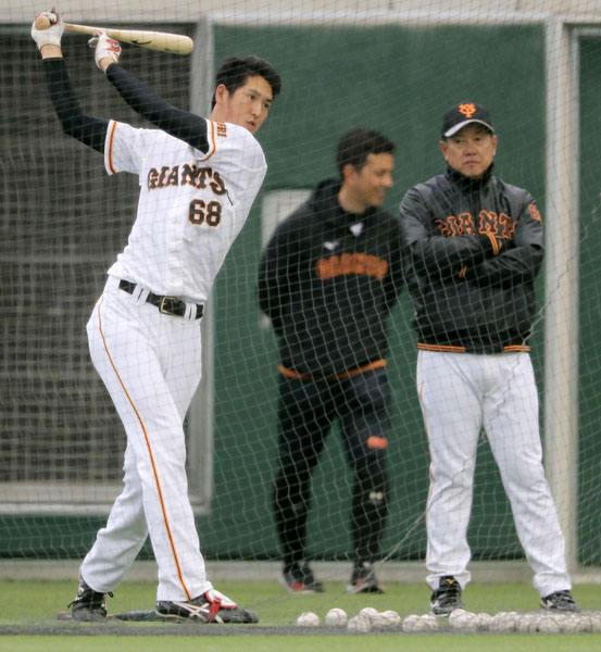 原監督(右)が見守る中、打撃練習を行う秋広(C)共同通信社