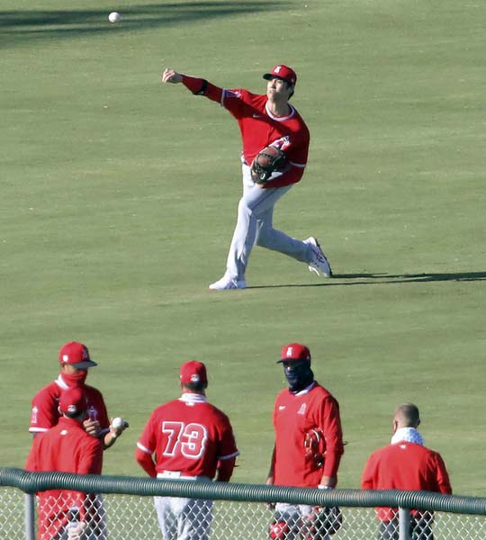 キャンプ初日、キャッチボールをする大谷(C)共同通信社