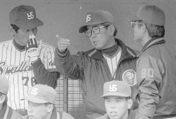 就任1年目の1990年3月、采配を振る野村監督(央)。右は丸山コーチ、左は伊勢コーチ(C)共同通信社